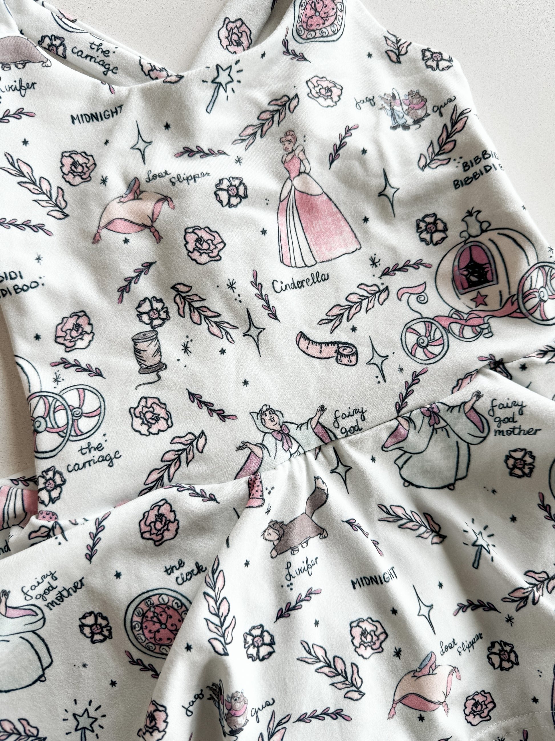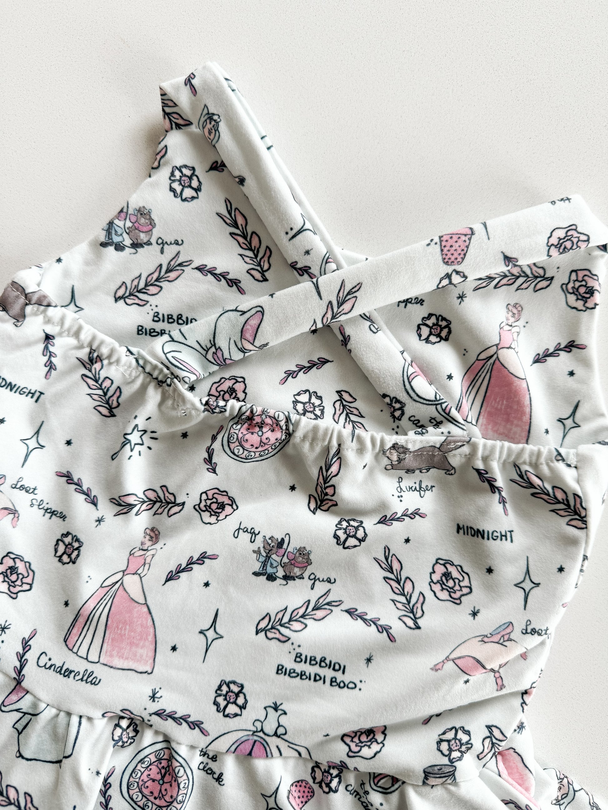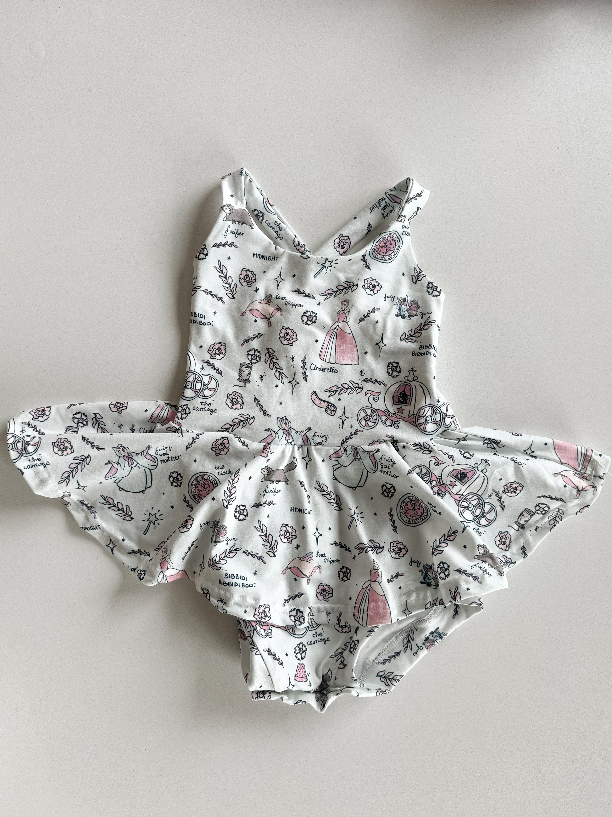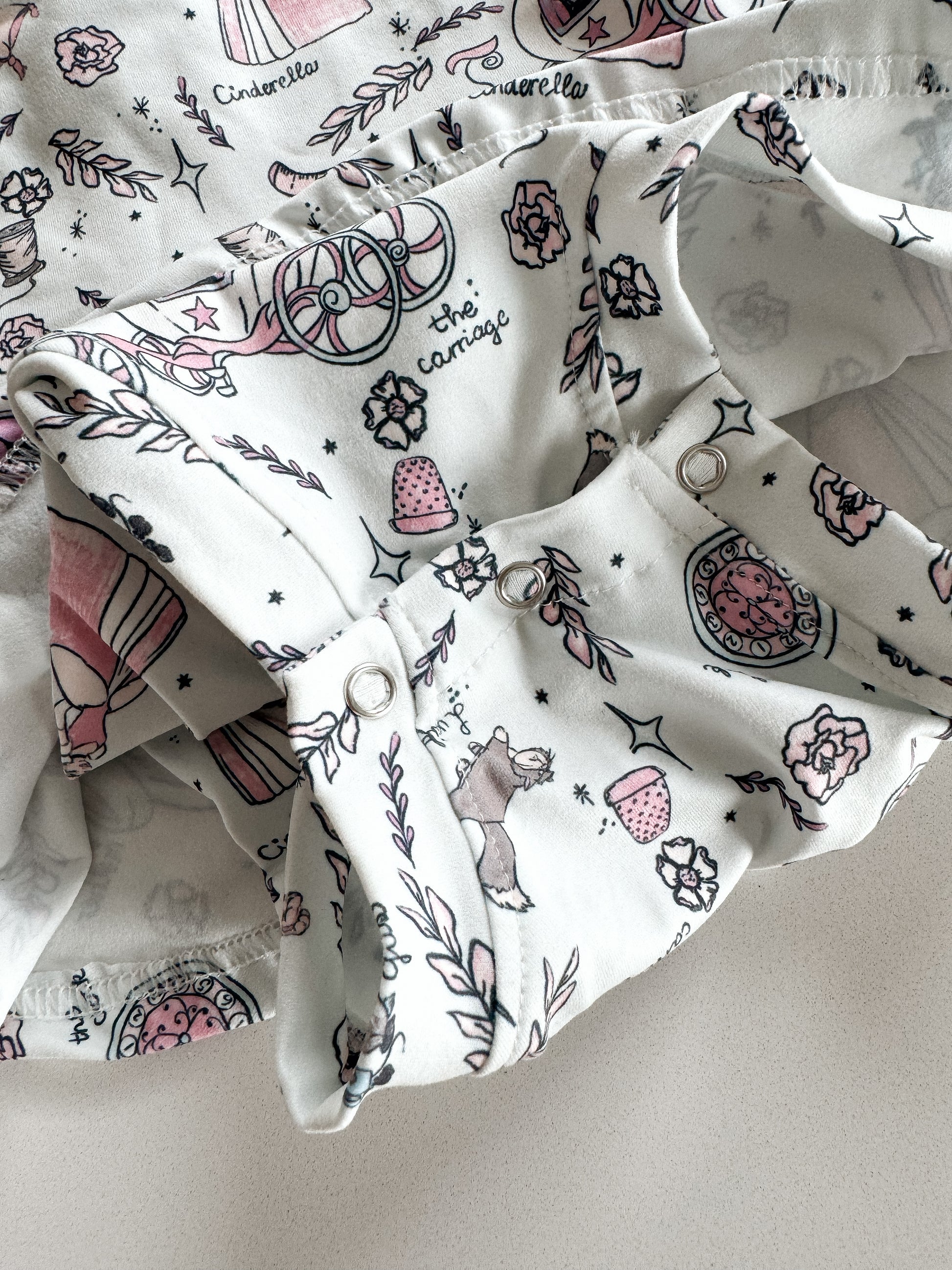 Princess onesie with skirt. Button snaps between the legs for easy diaper changes / restroom ease.